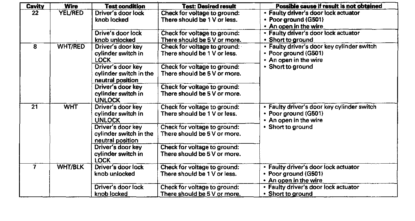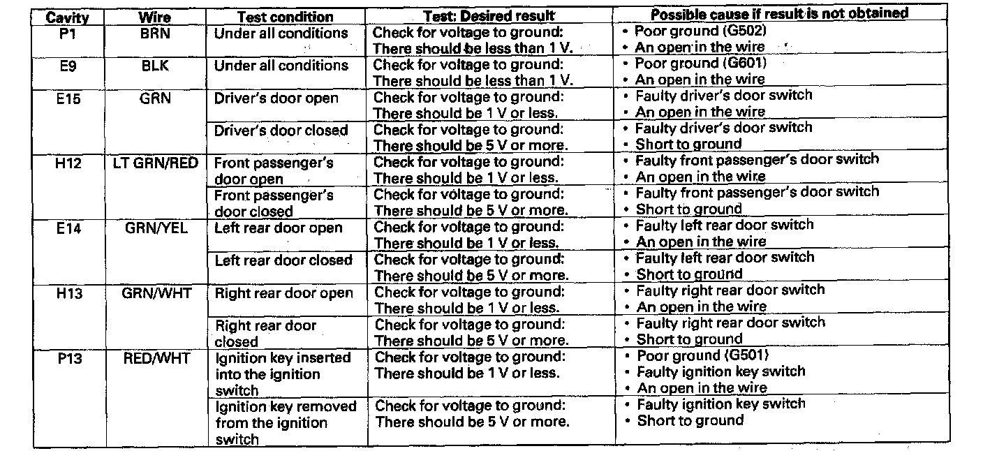 10. Reconnect the connector to the door multiplex control unit, turn the ignition switch ON (II), and make these input tests at the connector.
