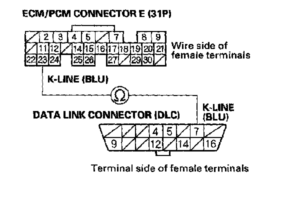 10. Check for continuity between DLC terminal No. 7 and ECM/PCM terminal E23.