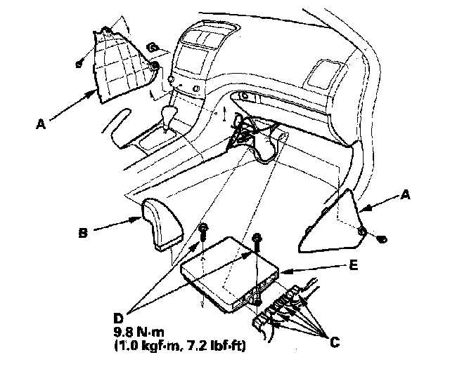 5. Remove the bolts (D), then remove the ECM/PCM (E).