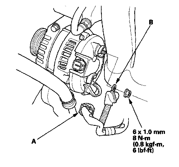 5. Disconnect the alternator connector (A) and BLK wire (B) from the alternator.