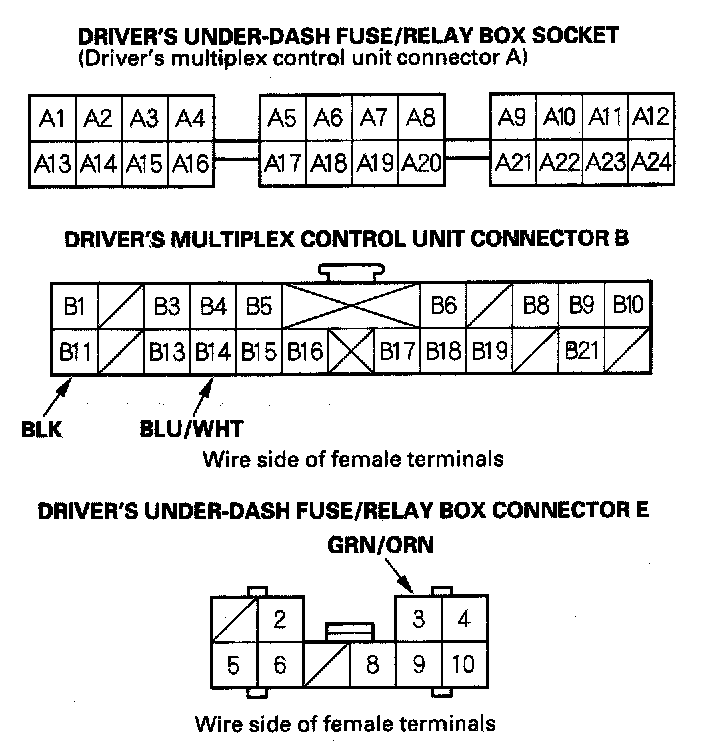 5. Reconnect the driver's multiplex control unit to the driver's under-dash fuse/relay box, turn the ignition switch ON (II) to keep the system awake, and make these input tests at the appropriate connectors on the driver's under-dash fuse/relay box.