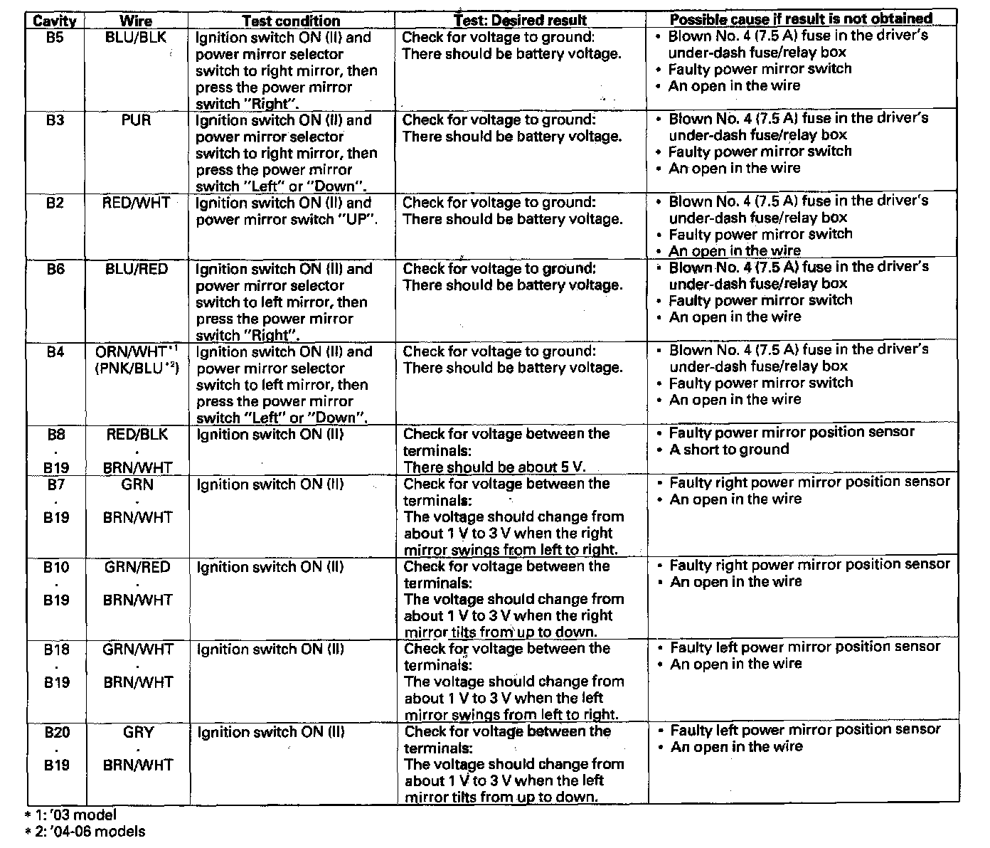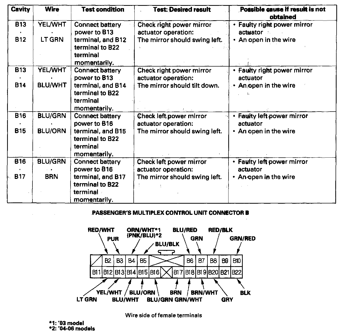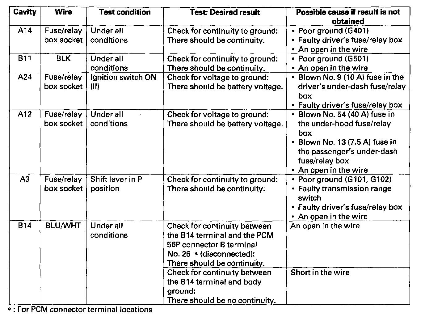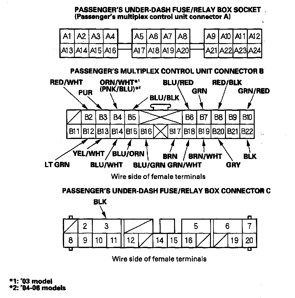 9. Reconnect the passenger's multiplex control unit to the passenger's under-dash fuse/relay box, and make these input tests at the appropriate connectors on the passenger's under-dash fuse/relay box.