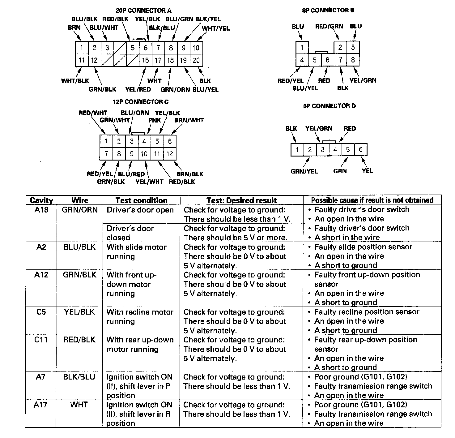 5. Reconnect the connectors to the driver's power seat control unit, turn the ignition switch ON (II) to keep the system awake, and make these input tests at the connectors.