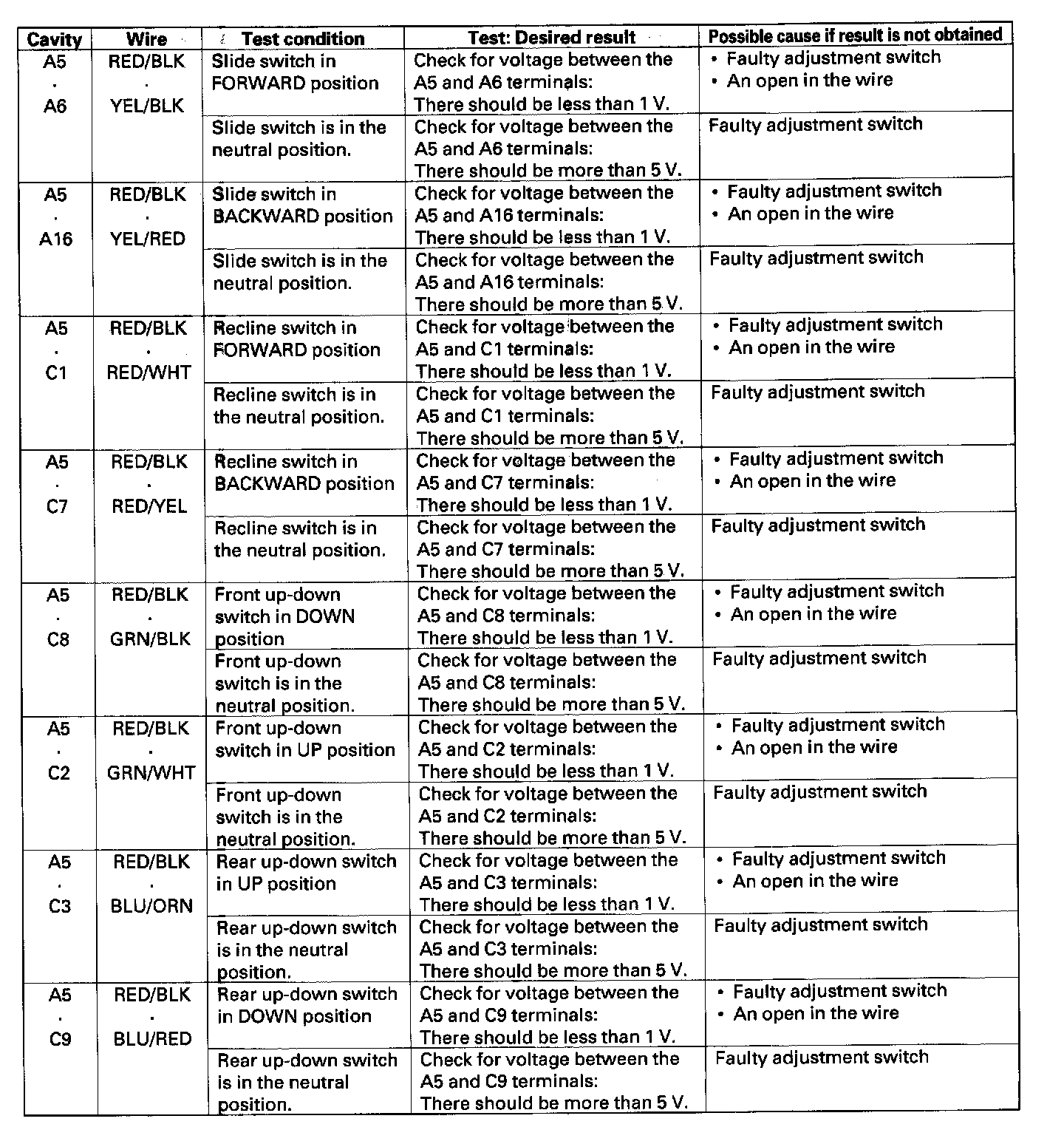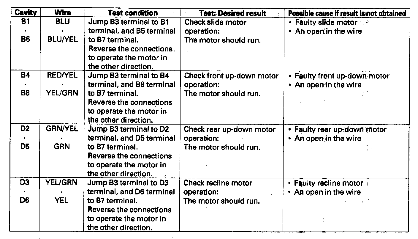 4. With the power seat control unit connectors still disconnected, make these input tests at the connector.