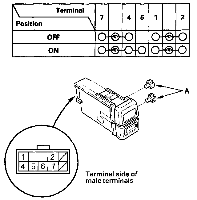 3. Check for continuity between the terminals in each switch position according to the table. If there is no continuity, replace illumination bulbs (A) or the switch.