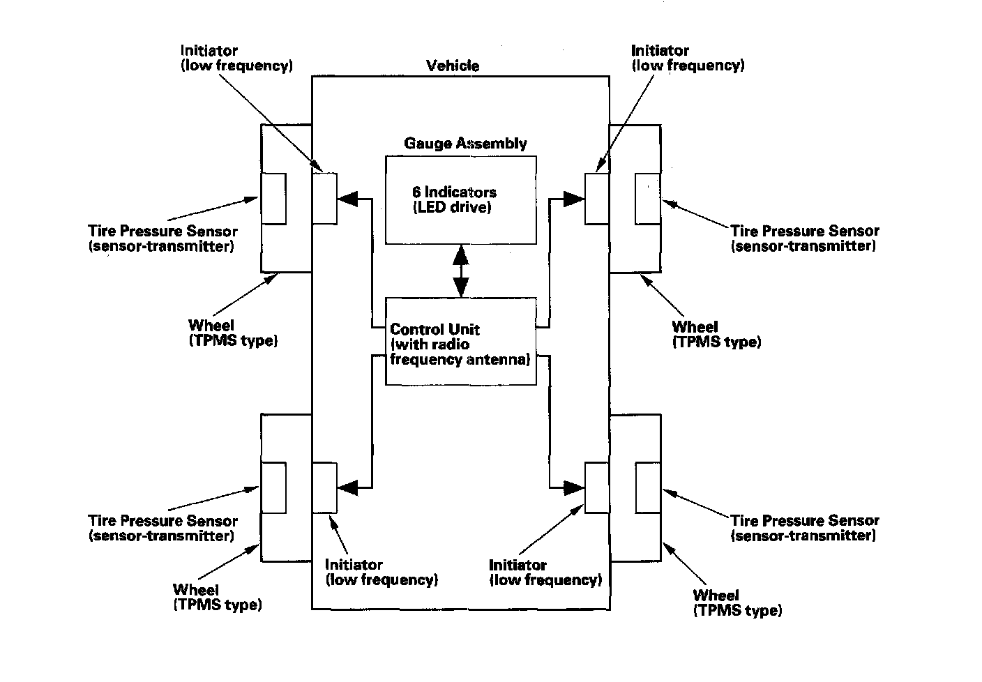 Whenever the engine is running, the TPMS control unit continuously monitors all four tires and the system. If it detects low pressure in a tire, it alerts the driver by turning on the low pressure indicator and the appropriate tire indicator. If it detects a problem in the system, it turns on the TPMS indicator.