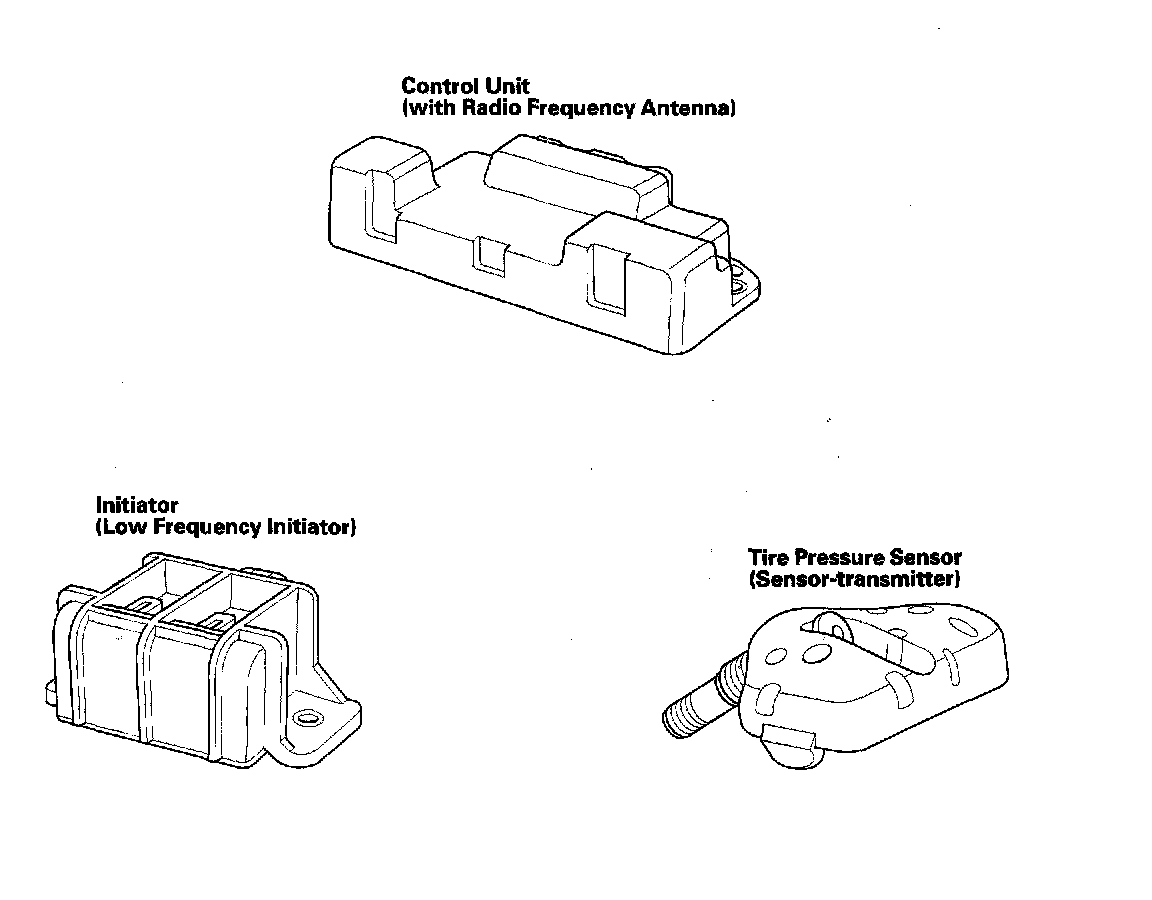 Each sensor is an integrated unit made up of the tire valve stem, a pressure sensor, and a transmitter. The unit is attached to the inside of the wheel, around the valve stem. The sensor transmits a signal to the control unit when tire pressure is less than 176 kPa (1.8 kgf/cm2, 26 psi). The control unit then turns on the low pressure indicator and the appropriate tire indicator(s). When that tire's pressure is increased to more than 198 kPa (2.0 kgf/cm2, 29 psi), the transmitter stops sending the signal, and the control unit turns the indicators off.