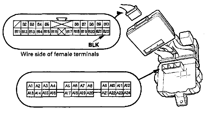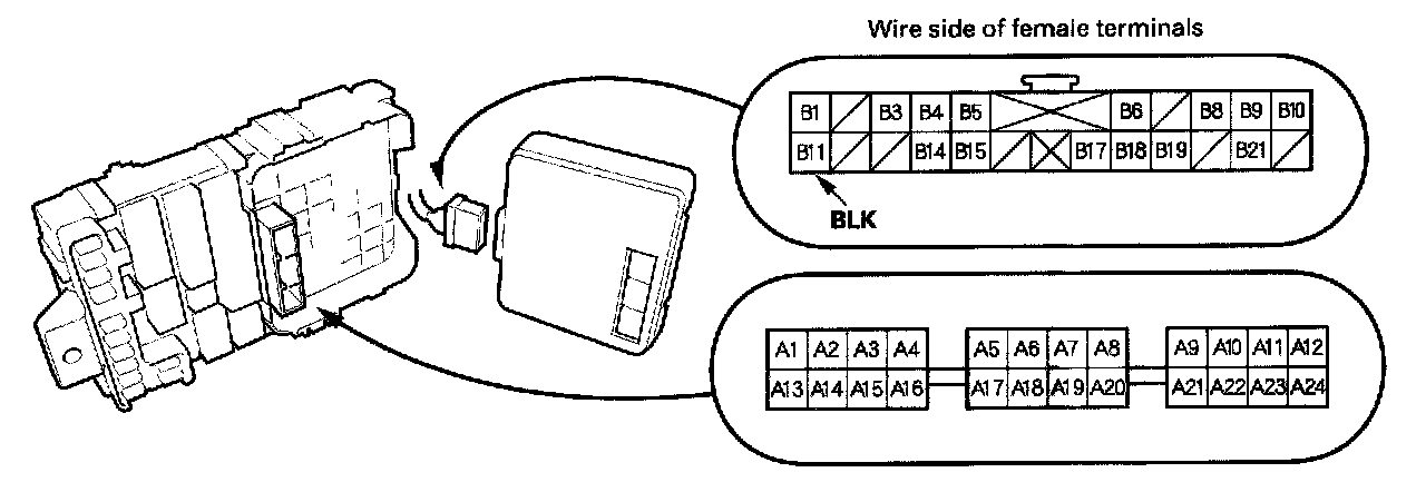 10. Make the following input tests at 22P connector B and the driver's under-dash fuse/relay box socket connector A. Be careful not to spread the fuse box connectors.