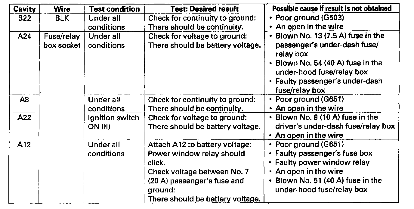3. Make the following input tests at the 22P connector B and the passenger's under-dash fuse/relay box socket connector A. Be careful not to spread the fuse box connectors.