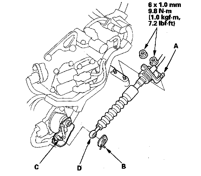 6. Remove the spring clip/washer (B) from the control lever (C), and disconnect the shift cable end (D) from the control lever.
