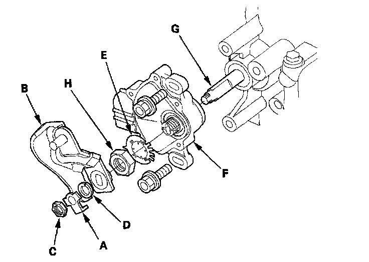 8. Pry the lock tabs of the lock washer (E) on the transmission range switch (F), hold the selector control shaft (G) with a 6.0 mm wrench, and loosen the locknut (H).