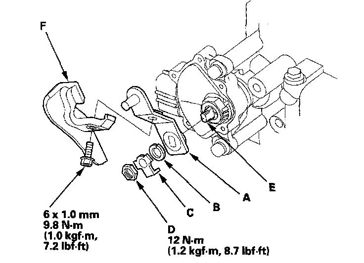 13. Install the new lock washer (A) over the selector control shaft (B) with aligning the projection (C) of the lock washer with the N positioning line (D) on the transmission range switch (E), and install the locknut (F).