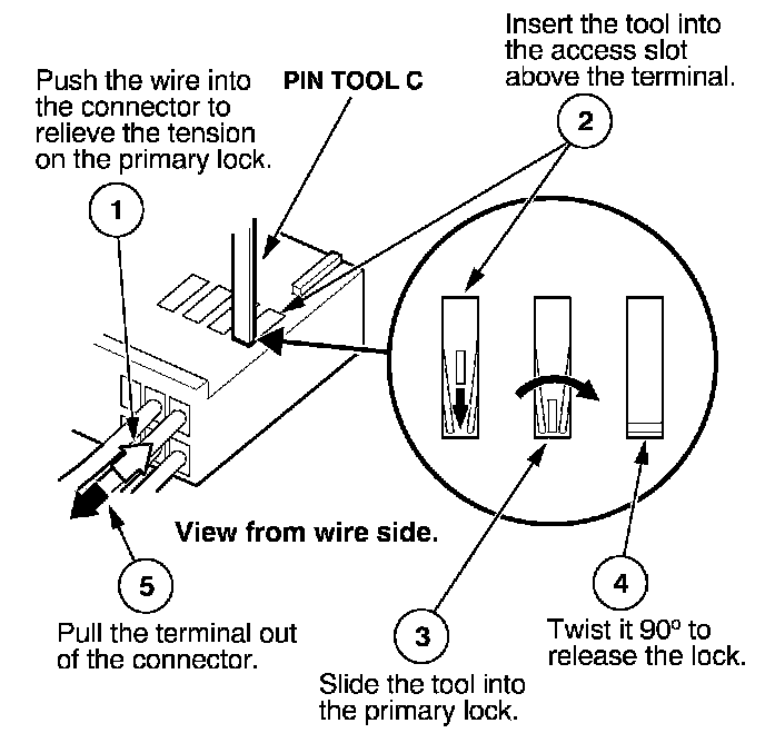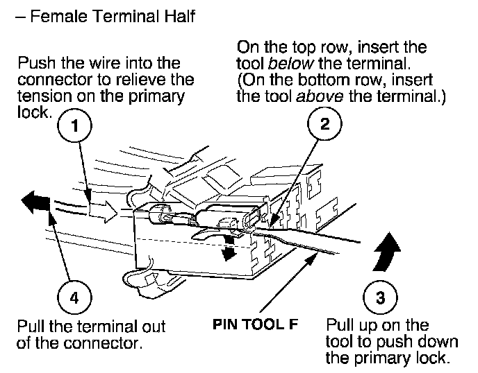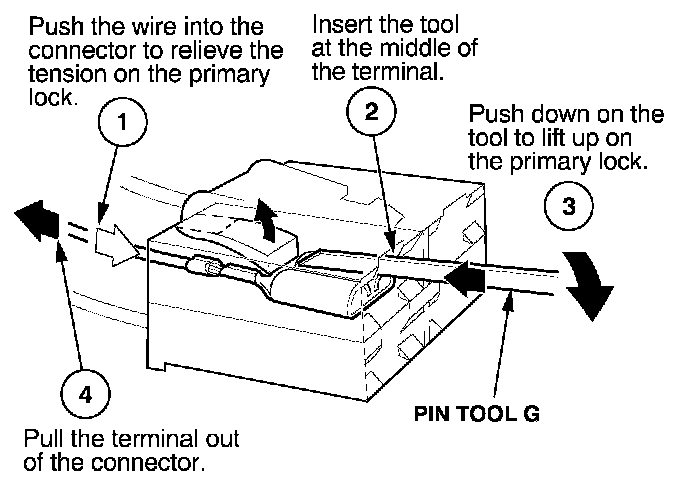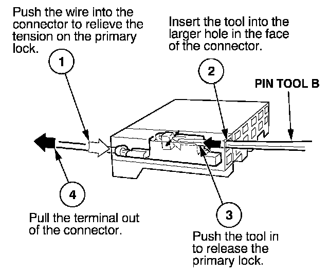 Before you begin, inspect the wire you are about to repair for damage and length. Make sure the wire will be long enough to make a terminal repair without stretching it when you reinstall the terminal in the connector. If the wire is too short, or if access to the connector is too restricted to make a terminal repair, you may need to install a pigtail terminal (a short length of wire with a factory-crimped terminal on it). Refer to HOW TO INSTALL PIGTAIL TERMINALS.