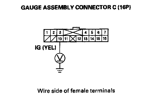 8. Check for voltage between gauge assembly connector terminal C10 (YEL) and body ground with the ignition switch turned ON (II). There should be battery voltage. If there is no voltage, check for a blown No. 9 (10 A) fuse in the driver's under-dash fuse/relay box or an open in the wire.