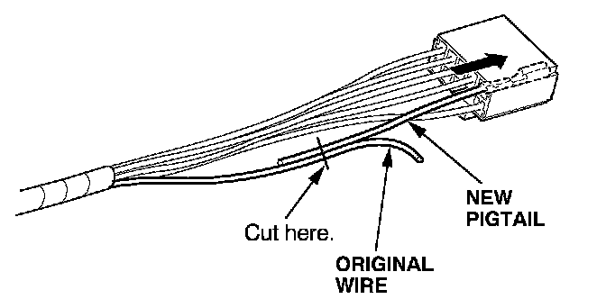 6. Lay the pigtail and the original wire side-by-side, and cut off both ends at once. If you are making more than one splice, do not cut each pigtail at the same location; the resulting "lump" of splice connectors would interfere with rewrapping the harness. Instead, cut the first pigtail close enough to the terminal so you will have room to make each remaining cut about 20 mm (3/4 inch) farther down on the next pigtail.