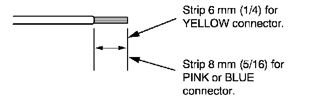 7. If you are using a yellow splice connector, strip about 6 mm (1/4 inch) of insulation off the ends of both wires. If you are using a pink or blue splice connector, strip off about 8 mm (5/16 inch) of insulation.