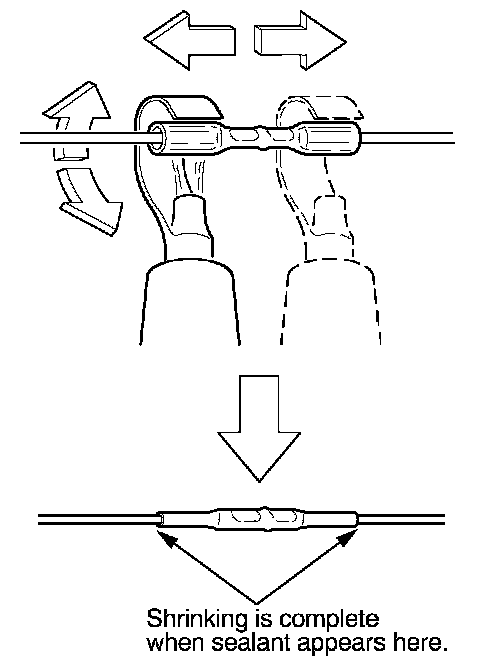 13. Plug in the heat gun, and turn it on. Start at the middle of the splice connector, and move the gun toward the ends as the tube shrinks. Apply heat evenly by rotating the curved heat spreader around the splice connector. Shrinking is complete when a small amount of sealant appears at each end of the tube.