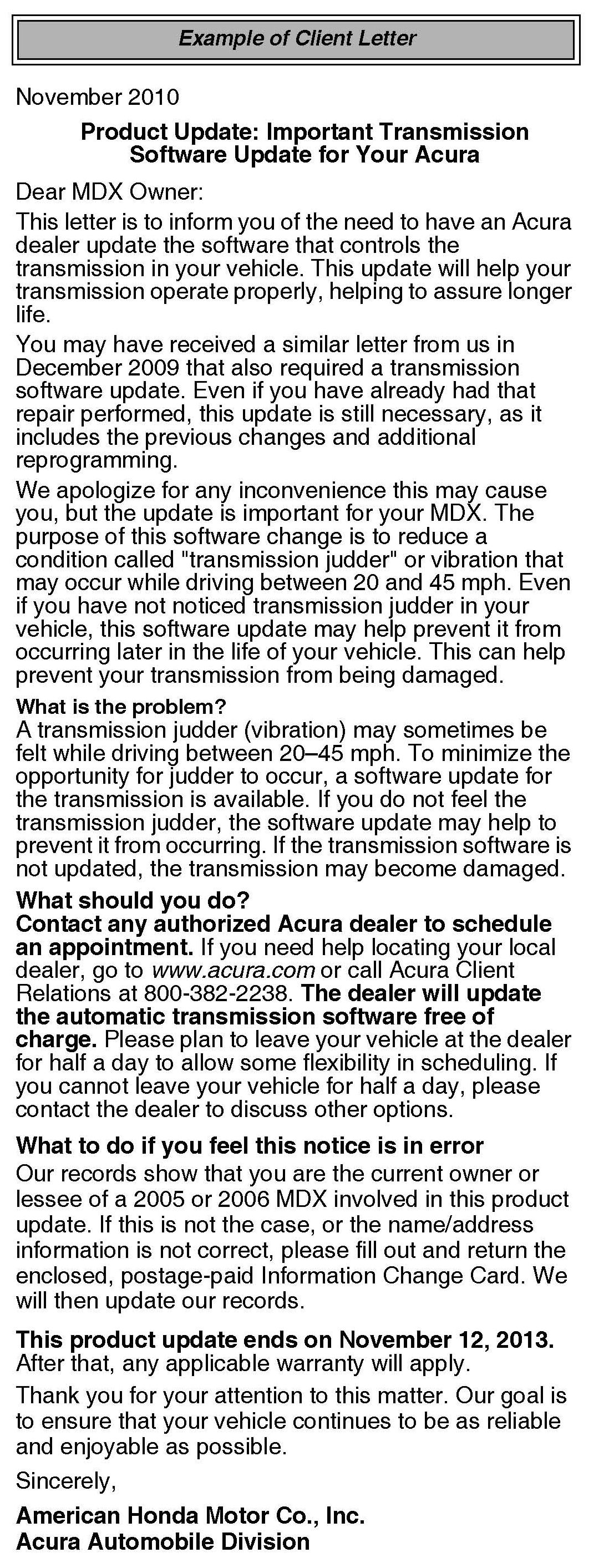 Home >> Acura >> 2006 >> MDX V6-3.5L >> Repair and Diagnosis >> Relays and Modules >> Relays and Modules - Powertrain Management >> Relays and Modules - Computers and Control Systems >> Engine Control Module >> Technical Service Bulletins >> All Technical Service Bulletins >> Campaign - ECM Update For TCC Lock Up Function