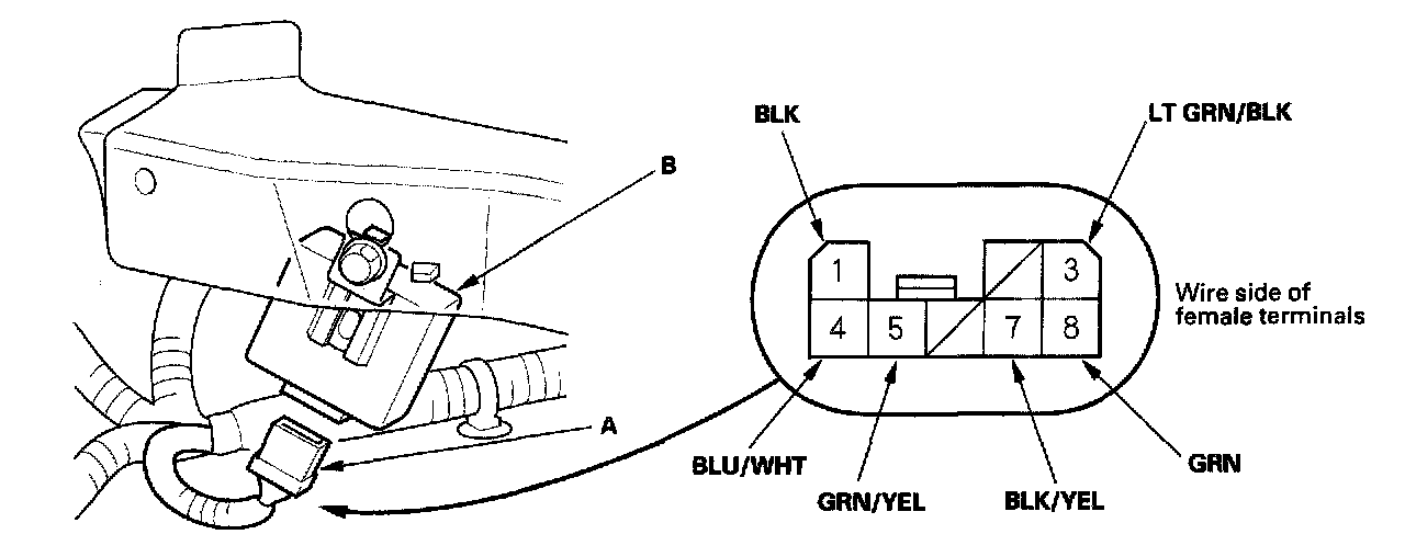 2. Disconnect the 8P connector (A) from the rear window wiper intermittent control unit (B).