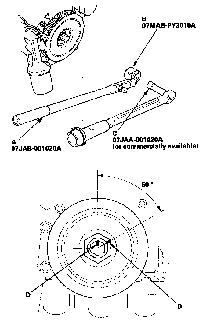 - 2 Mark (D) the bolt head and crankshaft pulley as shown, then tighten the bolt an additional 60° (The mark on the bolt head line up with the mark on the crankshaft pulley).