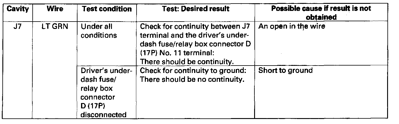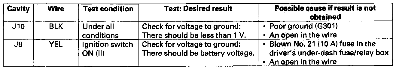 5. Disconnect the under-hood fuse/relay box connector J (10P), and make these input tests at the connector.