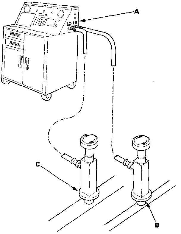 1. Connect an R-134a refrigerant recovery/recycling/charging station (A) to the high-pressure service port (B) and the low-pressure service port (C), as shown, following the equipment manufacturer's instructions.
