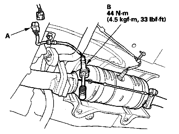 1. Disconnect the A/F sensor 4P connector (A), then remove the A/F sensor (B).
