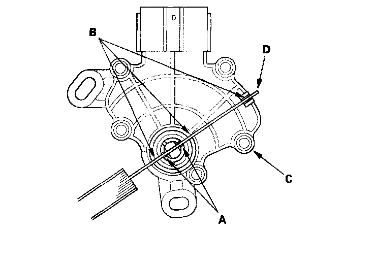 7. Align the cutout (A) on the rotary-frame with the neutral positioning cutouts (B) on the transmission range switch (C), then put a 2.0 mm (0.08 inch) feeler gauge blade (D) in the cutouts to hold it in the N position.