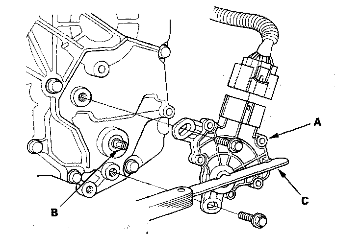 8. Install the transmission range switch (A) gently on the selector control shaft (B) with holding the N position with the 2.0 mm (0.08 inch) blade (C).