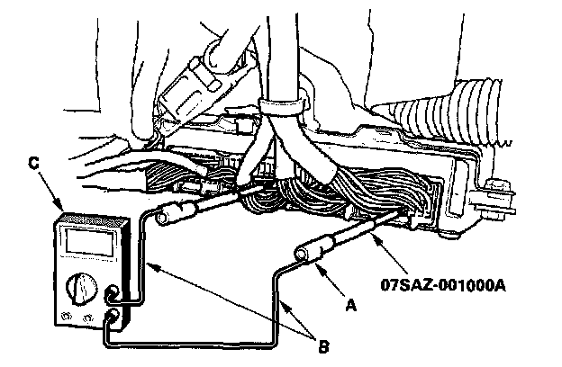 1. Connect the backprobe adapters (A) to the stacking patch cords (B), and connect the cords to a digital multimeter (C).