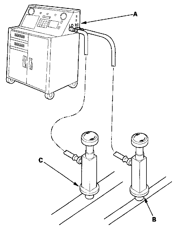 1. Connect an R-134a refrigerant recovery/recycling/charging station (A) to the high-pressure service port (B) and the low-pressure service port (C), as shown, following the equipment manufacturer's instructions.