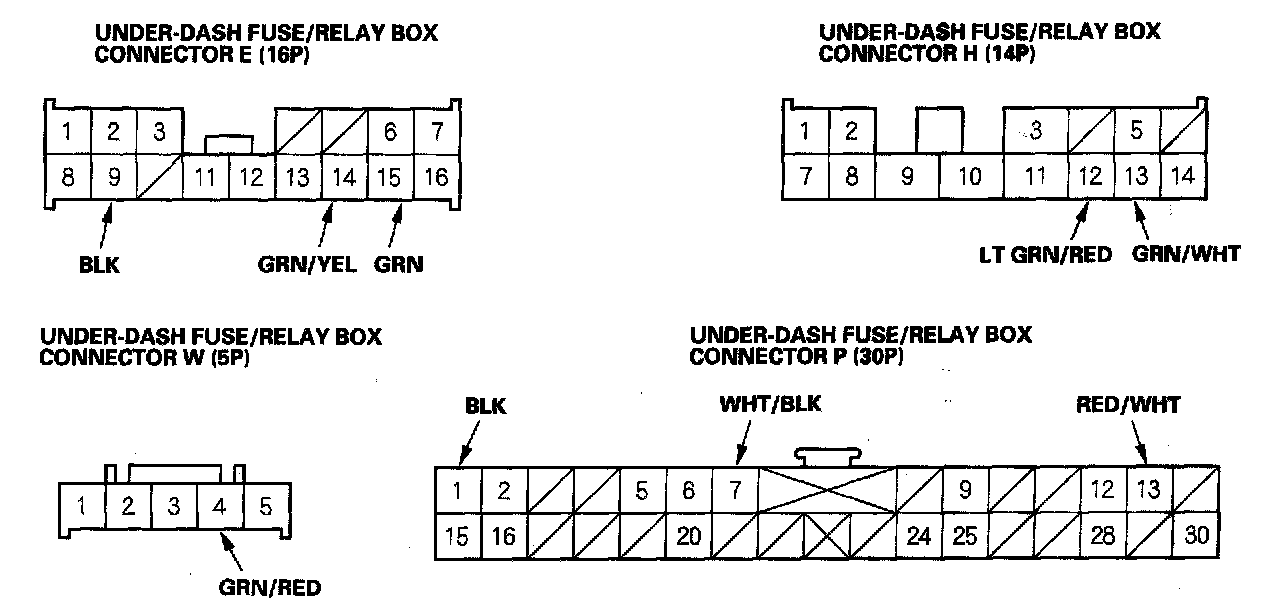 6. Reconnect the connectors to the under-dash fuse/relay box. Turn the ignition switch ON (II), and make these input tests at the appropriate connectors on the under-dash fuse/relay box.