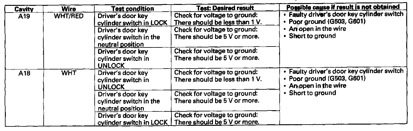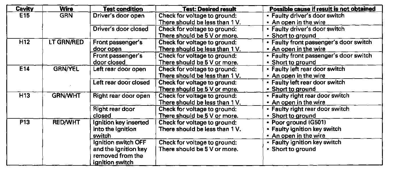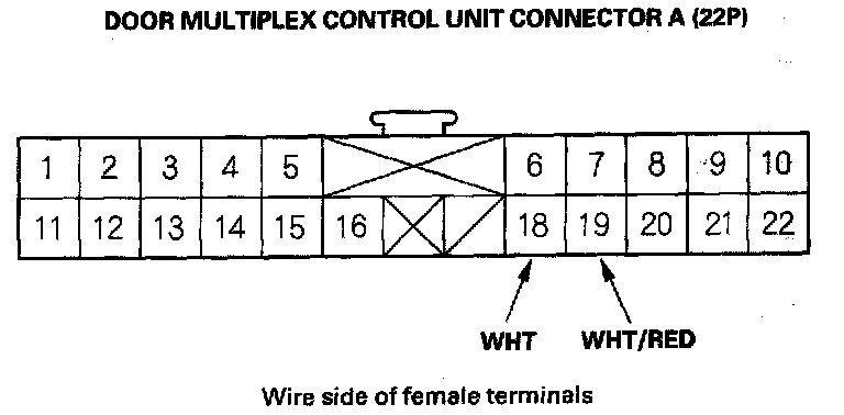 11. Reconnect the connector to the door multiplex control unit. Turn the ignition switch ON (II), and make these input tests at the appropriate connector.