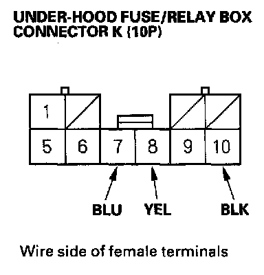 5. Disconnect the 10P connector from the under-hood fuse/relay box, and make these input tests at the connector.