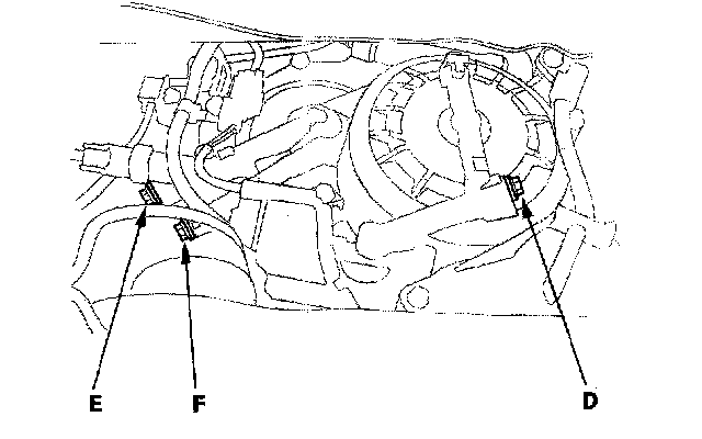 19. Release the brake pedal, then press the accelerator very slowly to increase engine speed to 2,000 rpm gradually over 10 seconds (the transmission will shift to 3rd, 4th, then 5th gear), and measure the 3rd clutch pressure at the 3rd clutch inspection port (D), 4th clutch pressure at the 4th clutch pressure inspection port (E), and 5th clutch pressure at the 5th clutch pressure inspection port (F).