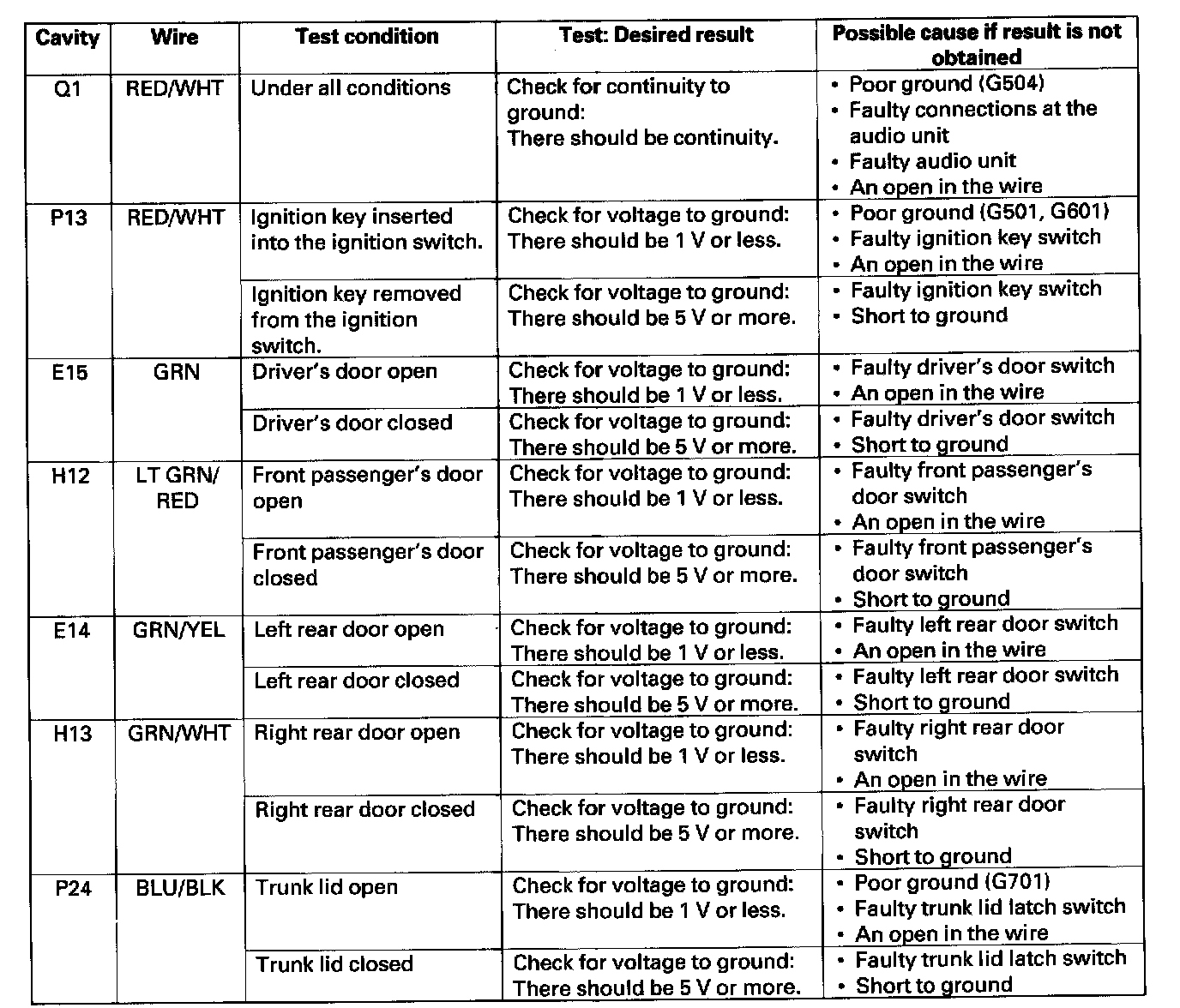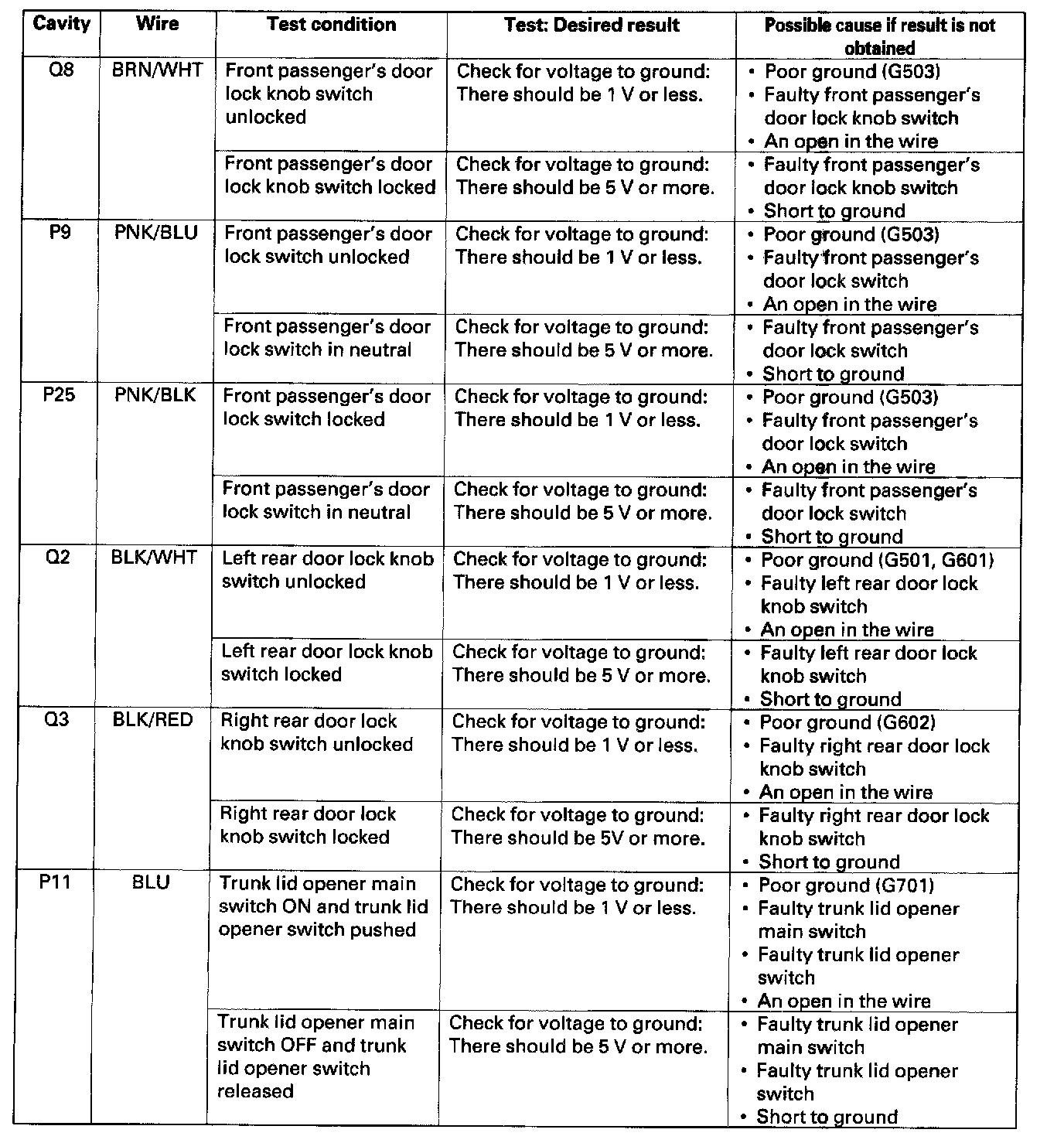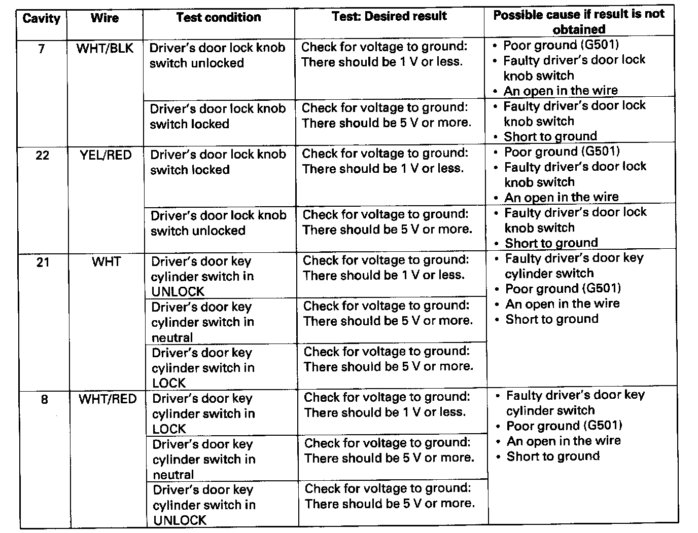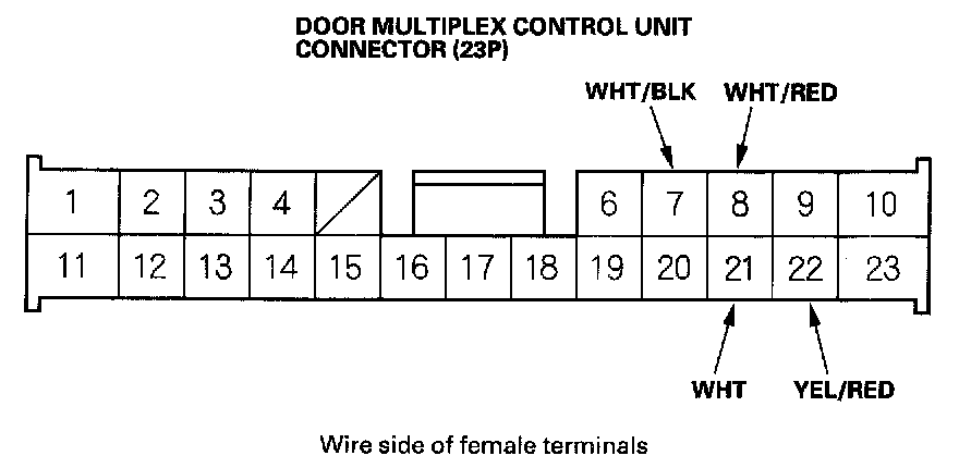 10. Reconnect the connector to the door multiplex control unit, and make these input tests at the connectors.