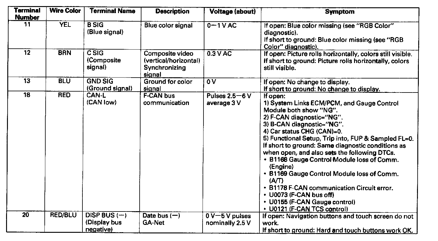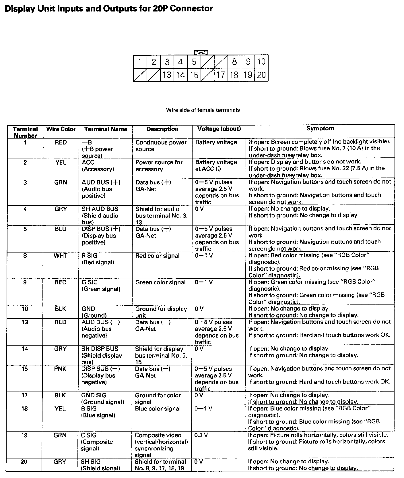 Display Unit Inputs And Outputs For 20P Connector: