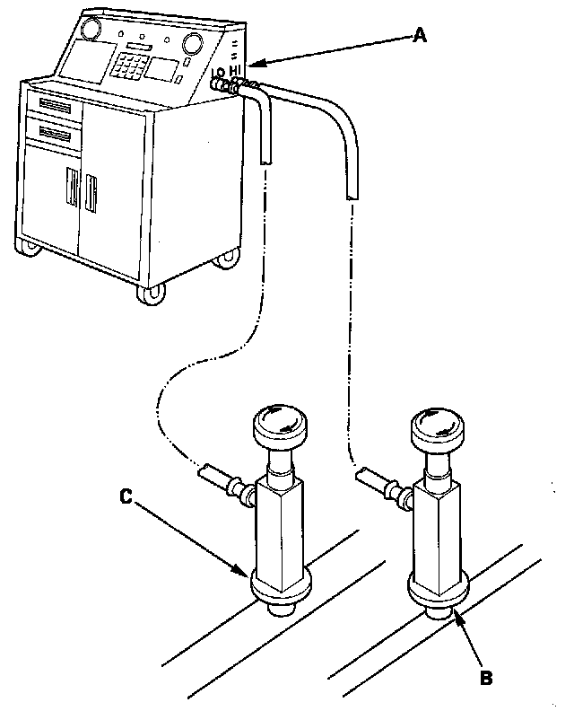 1. Connect an R-134a refrigerant recovery/recycling/charging station (A) to the high-pressure service port (B) and the low-pressure service port (C), as shown, following the equipment manufacturer's instructions.