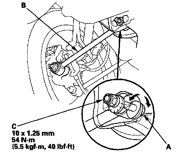 3. Hold the adjusting bolt (A) on the rear control arm (B), and loosen the self-locking nut (C).