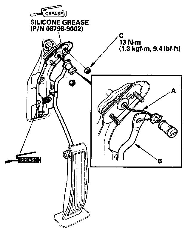 Remove the nuts (C) and the accelerator pedal.