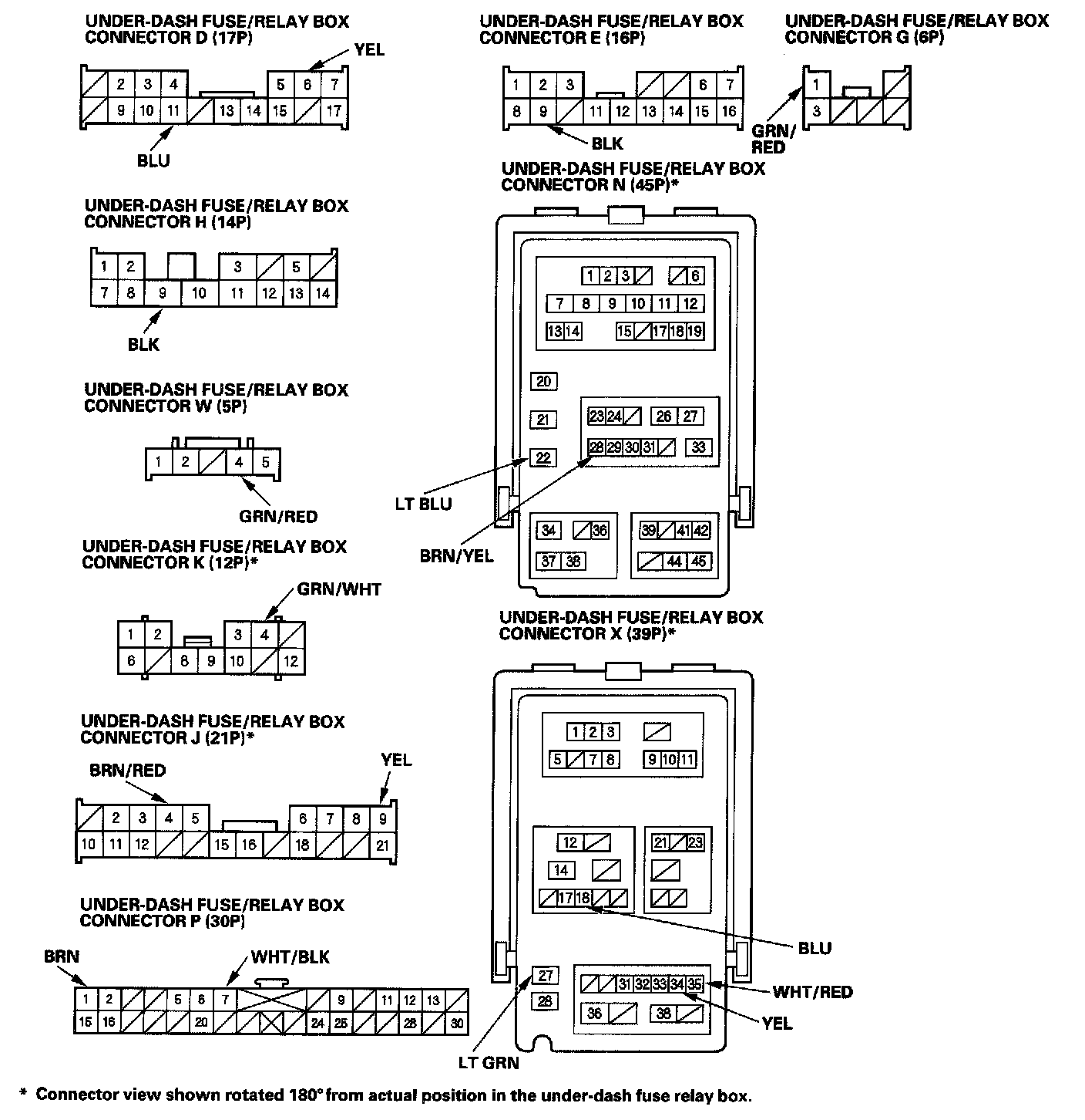 2. Disconnect the under-dash fuse/relay box connectors D, E, H, J, K, N, P, X, and W.