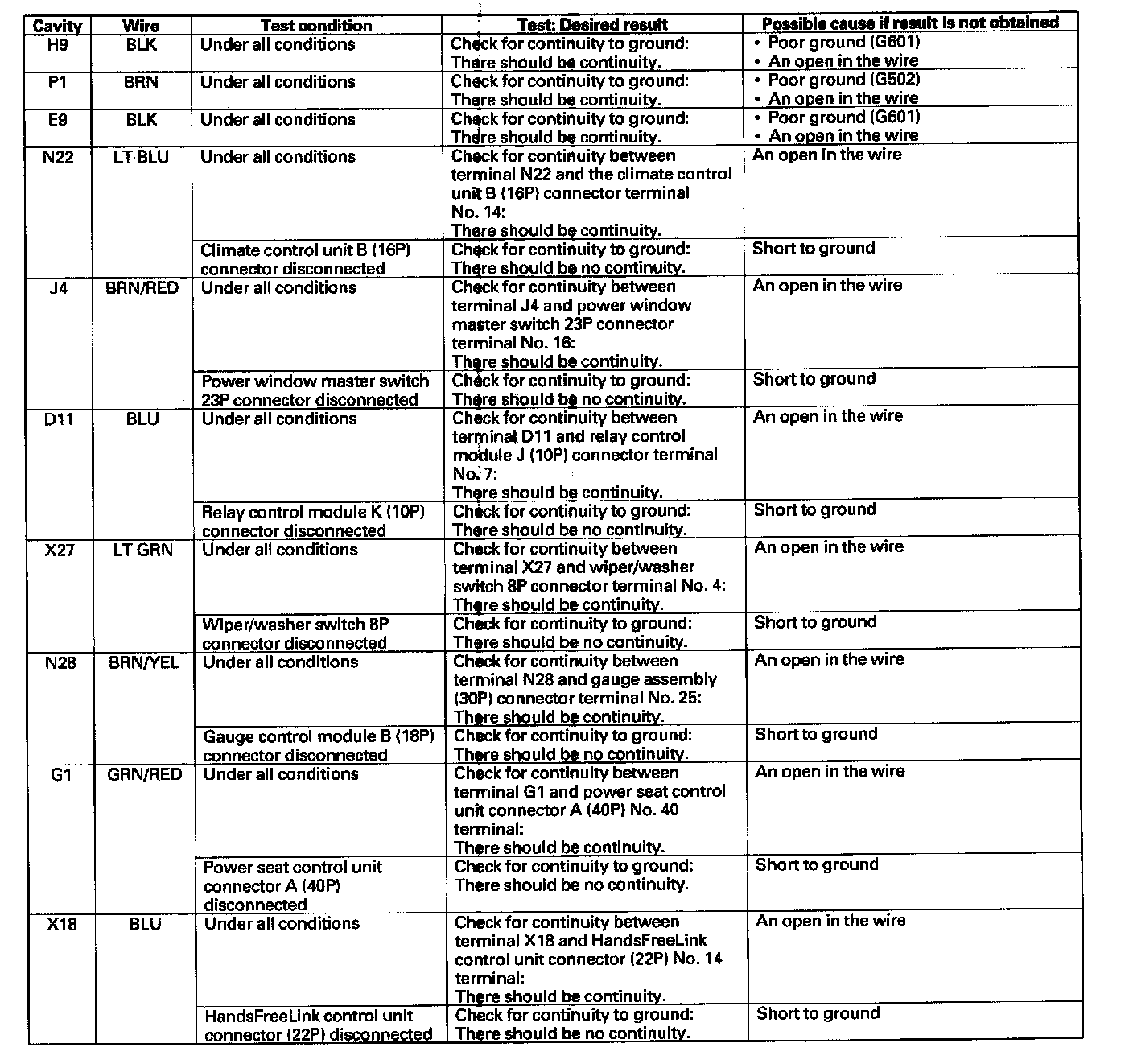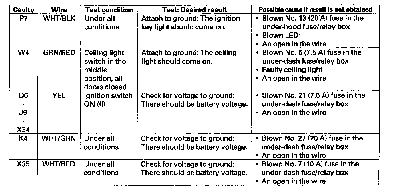 5. Reconnect the connectors to the under-dash fuse/relay box, and make sure these input tests at the appropriate connectors on the under-dash fuse/relay box.