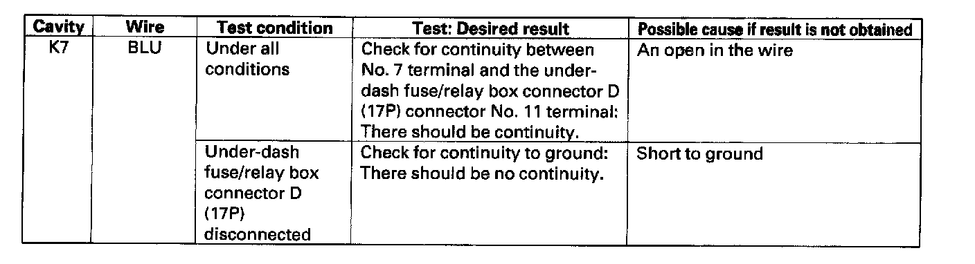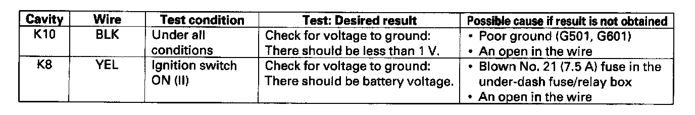 4. Reconnect the connector to the under-hood fuse/relay box, and make these input tests at the connector.