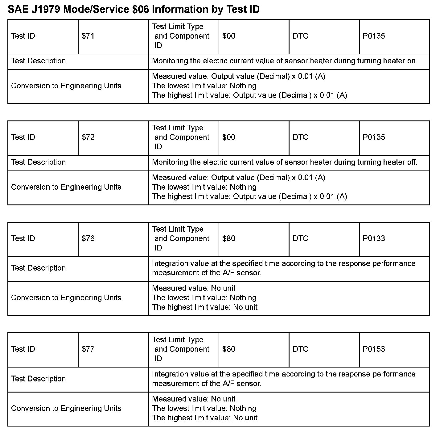SAE J1979 Information By Test ID ($71 - $77):