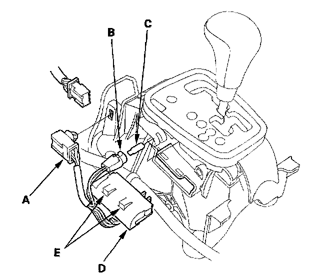 4. Remove the transmission gear selection switch/park pin switch (D) by releasing the lock tabs (E).