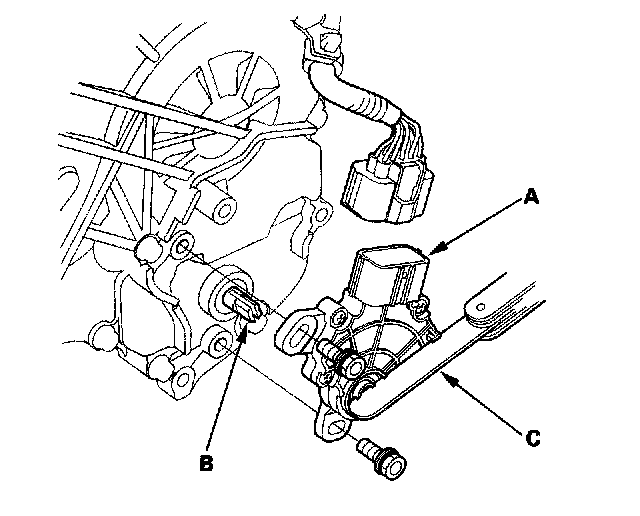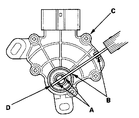 7. Align the cutouts (A) on the rotary-frame with the neutral positioning cutouts (B) on the transmission range switch (C), then put a 2.0 mm (0.08 inch) feeler gauge blade (D) in the cutouts to hold the switch in the N position.
