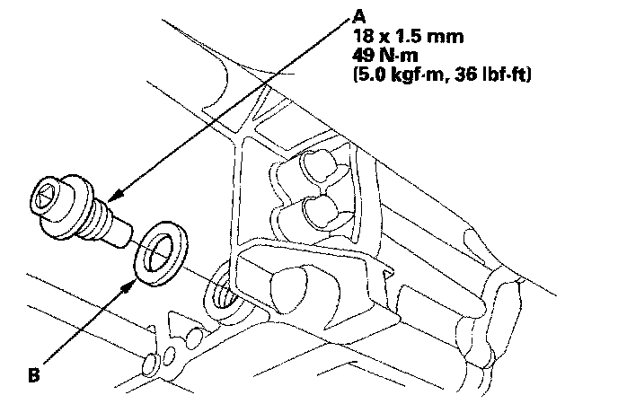 2. Remove the drain plug (A), and drain the automatic transmission fluid (ATF). Then reinstall the drain plug with a new sealing washer (B).