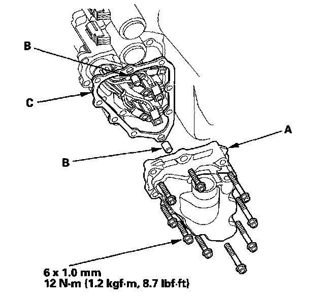 13. Remove the shift solenoid valve cover (A), dowel pins (B), and gasket (C).