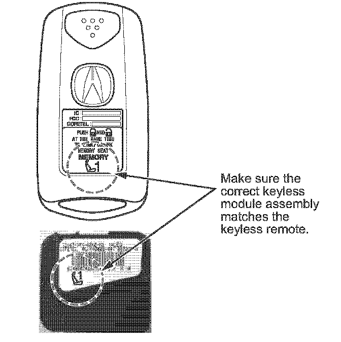 4. Install the new keyless module assembly. Check the back side of the remote transmitter or keyless module assembly to determine if you are replacing driver 1 or driver 2 (use applicable chart for P/Ns).