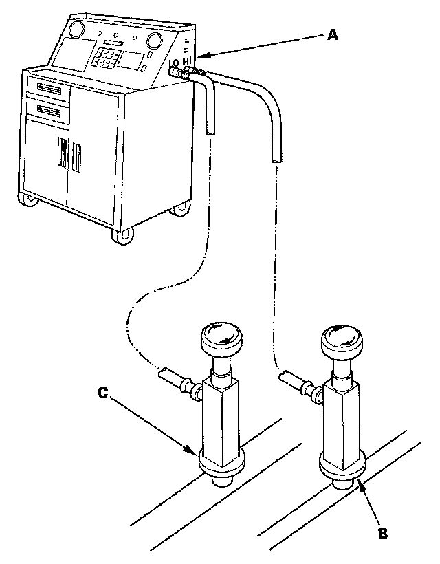 1. Connect an R-134a refrigerant recovery/recycling/charging station (A) to the high-pressure service port (B) and the low-pressure service port (C), as shown, following the equipment manufacturer's instructions.